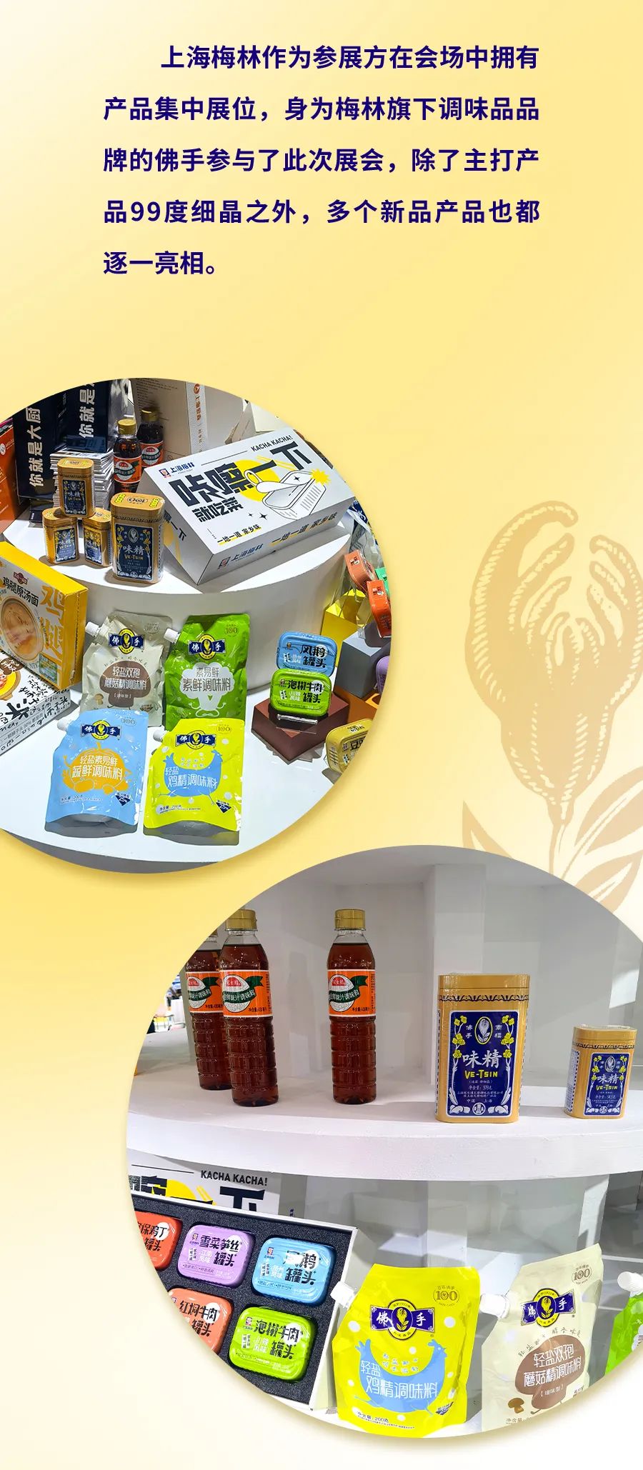 3月24日,首屆中國國際預(yù)制菜產(chǎn)業(yè)博覽會(huì)在廣東省東莞市的廣東現(xiàn)代國際展覽中心正式開幕。 上海梅林作為參展方在會(huì)場中擁有產(chǎn)品集中展位,身為梅林旗下調(diào)味品品牌的佛手參與了此次展會(huì),除了主打產(chǎn)品99度細(xì)晶之外,多個(gè)新品產(chǎn)品也都逐一亮相。